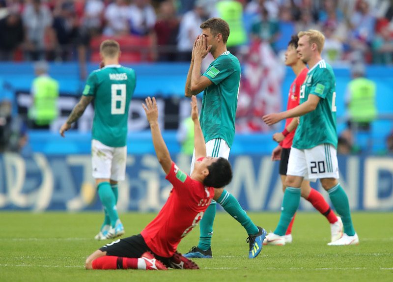 ロシア・ワールドカップ(W杯)のグループF第3戦、前回王者ドイツが韓国相手に後半アディショナルタイムの2失点によって0-2で敗戦。グループ最下位で同国史上初の1次リーグ敗退という悲劇となった。母国ドイツメディアも「悪夢」「歴史的な敗退」と速報した。4カ国全てに決勝トーナメント進出の可能性が残されたなかで第3戦を迎えた激戦のグループF。同時キックオフの2試合はいずれも0-0でハーフタイムを迎えた。この時点ではドイツも2位につけていた。 しかし、後半に入ると第2戦でドイツに1-2で敗れていたスウェーデンがメキシコ相手に3得点。攻撃陣が爆発し、自力で決勝トーナメント進出の切符を手にした。(Yahoo:FOOTBALL ZERO)