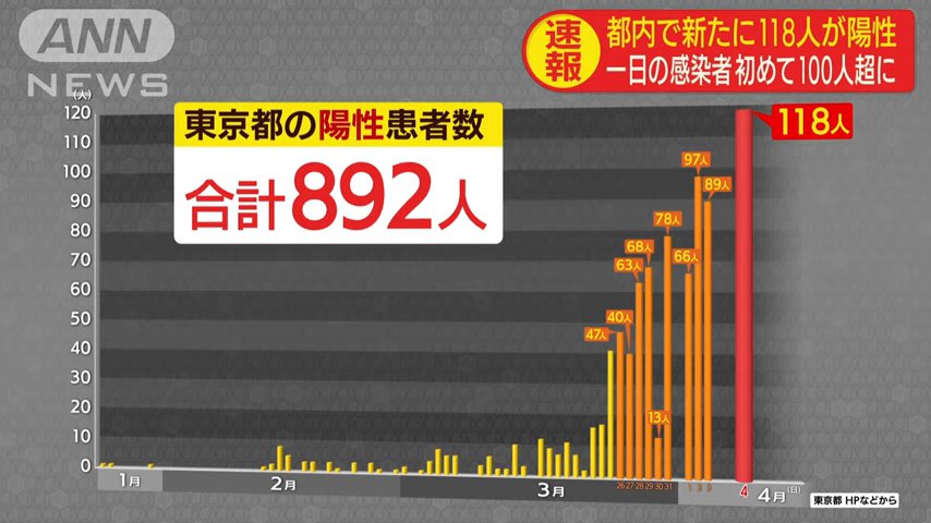 東京都は4日、新型コロナウイルスの感染が新たに118人確認されたと発表した。1日の確認数としては初めて100人を超えた。このうち68%に当たる81人の感染経路が4日時点では不明となっており、都は濃厚接触者を特定する調査を急いでいる。都内で感染確認されたのは累計で900人に迫った。また都は同日、都内で新型ウイルスに感染していた60~80代の男女5人が新たに死亡したと明らかにした。(日本経済新聞)