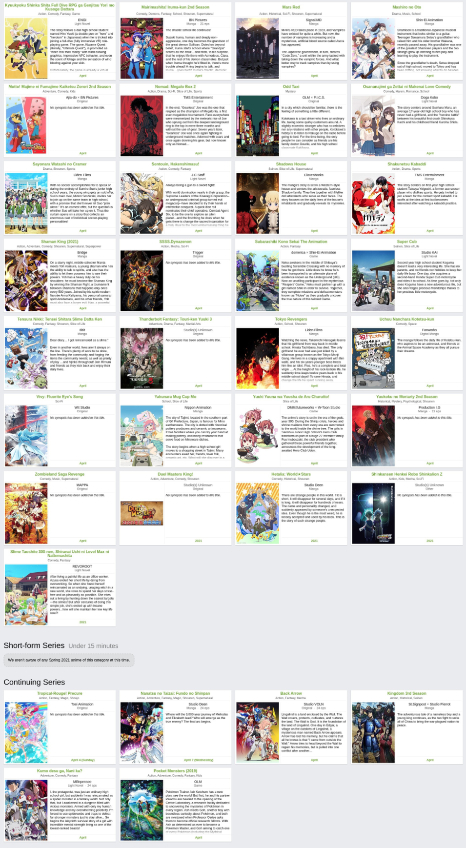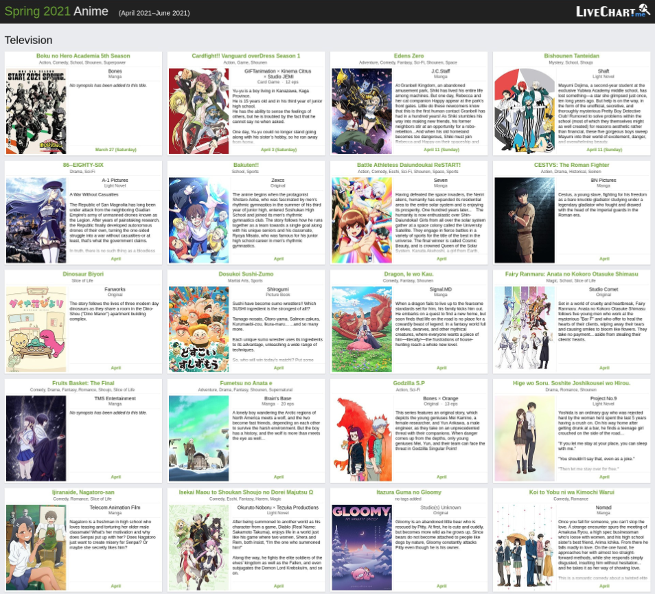 desuarchive.org/a/thread/217387748/desuarchive.org/a/thread/215442085/reddit.com/r/anime/comments/mbiq9z/what_anime_are_you_looking_forward_to_seeing_in/reddit.com/r/anime/comments/ltg1zu/what_spring_season_anime_are_you_most_excited_for/reddit.com/r/anime/comments/m0p80s/what_will_you_be_watching_from_the_spring_2021/reddit.com/r/anime/comments/m29kvk/what_upcoming_anime_are_you_excited_about_for/