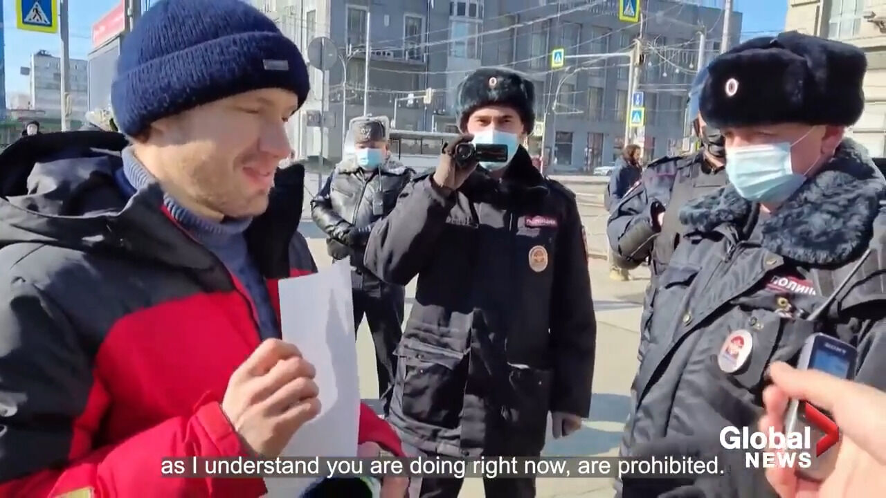 ※白紙を持っている男性に警察が「なぜ立っているのか?」「その紙は何を意図しているのか?」といった職質をし「ただ紙を見せているだけ」と答えた男性に対して、それが禁止行為であることを告げたうえで止めるように指示し、それに男性が従わなかったため、個人単位の抗議活動も禁止しているノヴォシビルスク条例に基づき連行しています