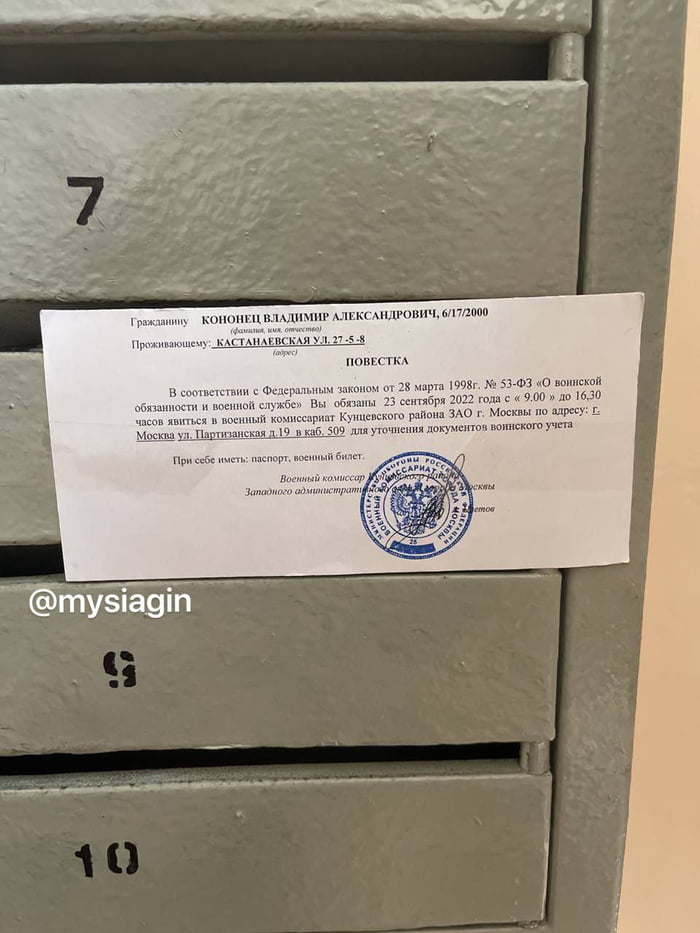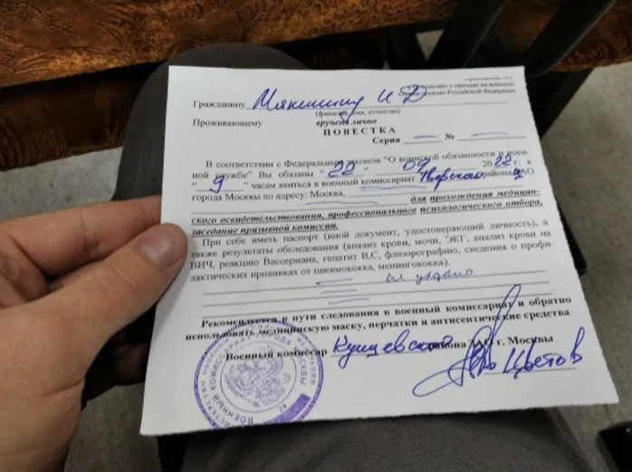OVD-Infoによるとモスクワの幾つかの警察署では動員令に抗議活動して拘留された人物に軍への徴兵書が渡されたとのこと