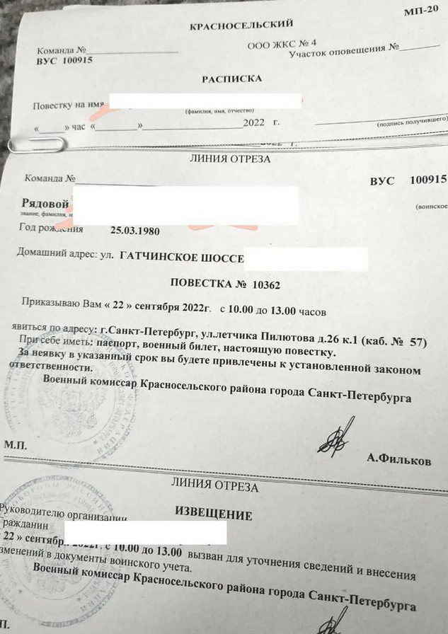 サンクトペテルブルクから届いた初の召集令状の写真。