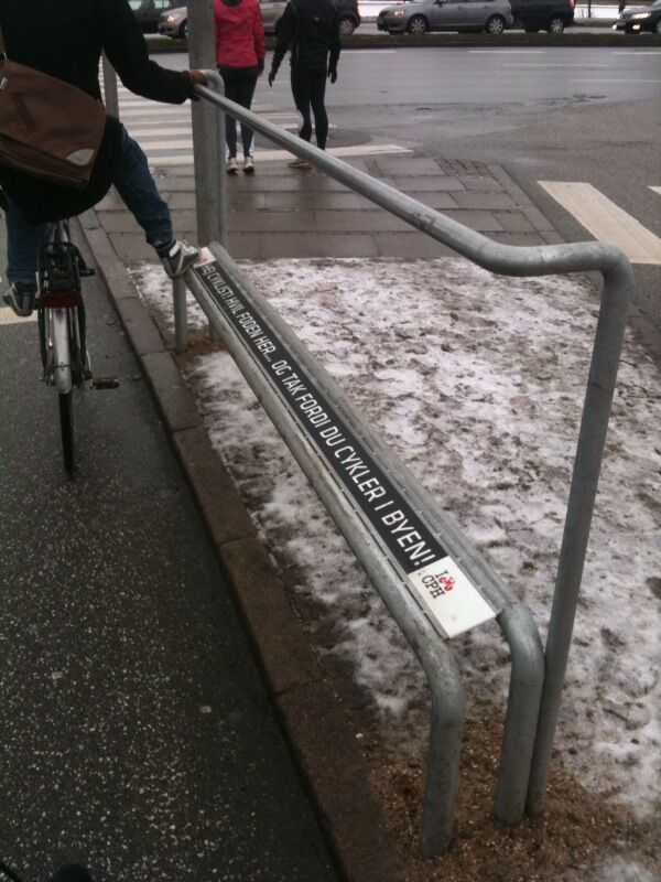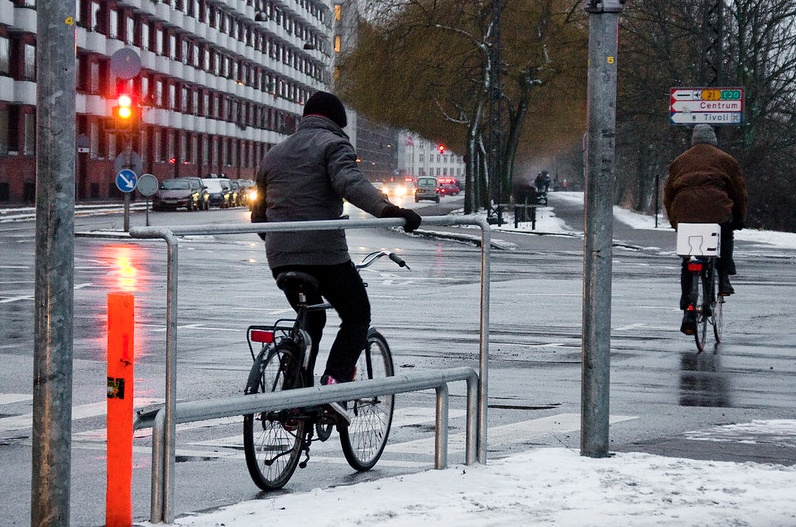 オールボー(これもデンマーク)の人が多い交差点なんかには、青信号を待つサイクリストが寄り掛かることのできるフェンスなんかもある。