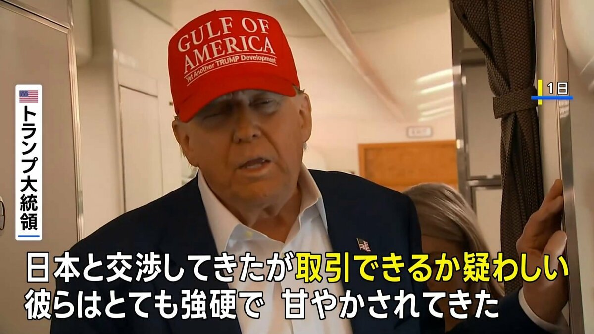トランプ米大統領は1日、日本との関税交渉について「合意できるか確信できない。疑わしい」と述べた。また、日本からの輸入品に対して「30%か35%、あるいは我々が決める数字」を関税としてかける可能性を示唆した。大統領専用機内で、記者団に語った。トランプ氏は「私たちは日本と交渉してきた。彼らは非常に強硬だ。彼らは非常に甘やかされてきた」と主張。日本がコメ不足で「コメを渇望しているのに(米国産の)コメを受け取らない」と批判。「彼らは車を受け入れないのに、数百万台を輸出している」との持論を改めて展開した。(Yahoo)