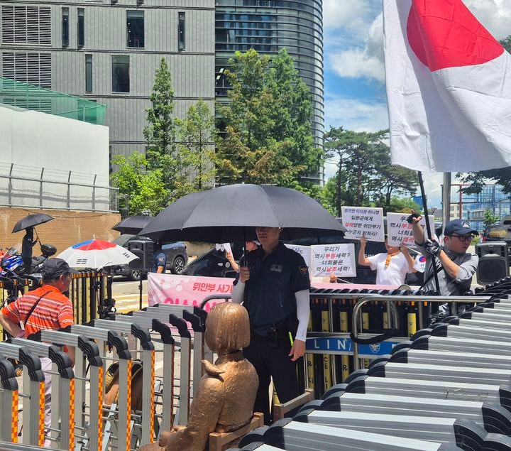 【韓国】慰安婦像の前に極右が集結し「慰安婦問題は詐欺だ!」と叫ぶ。